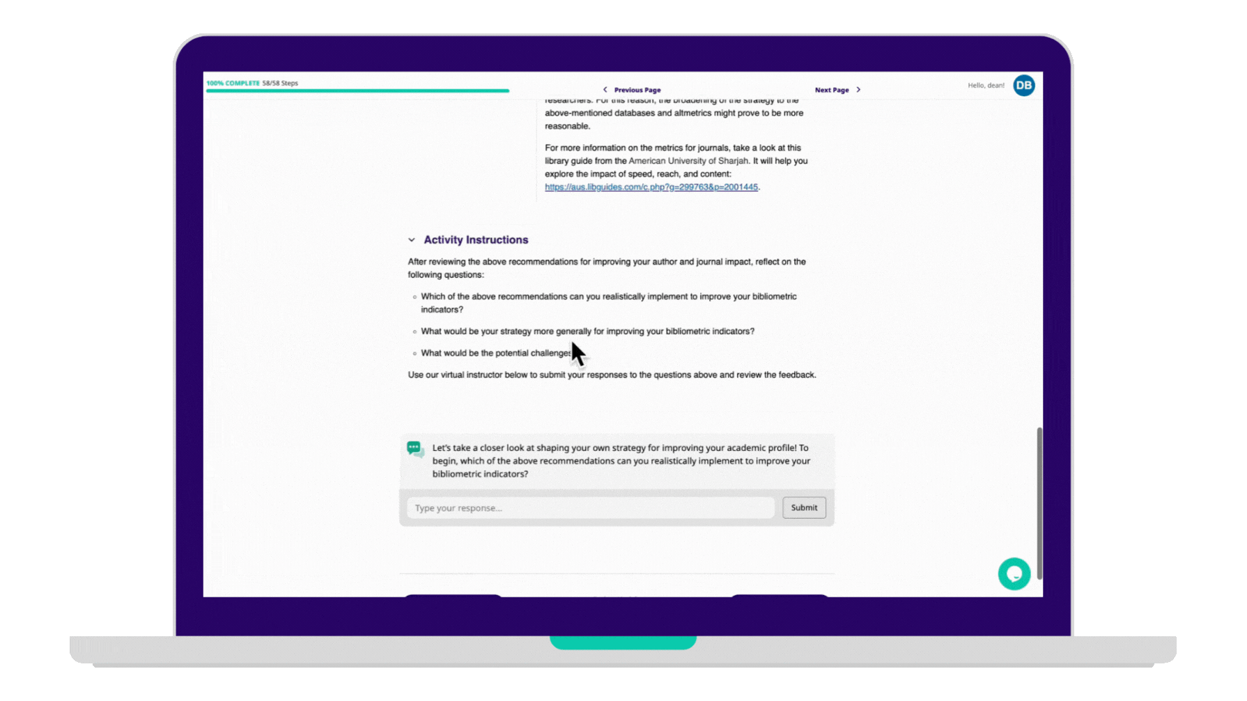 Submit your assignments and discuss with our virtual instructor for instant personalised feedback.